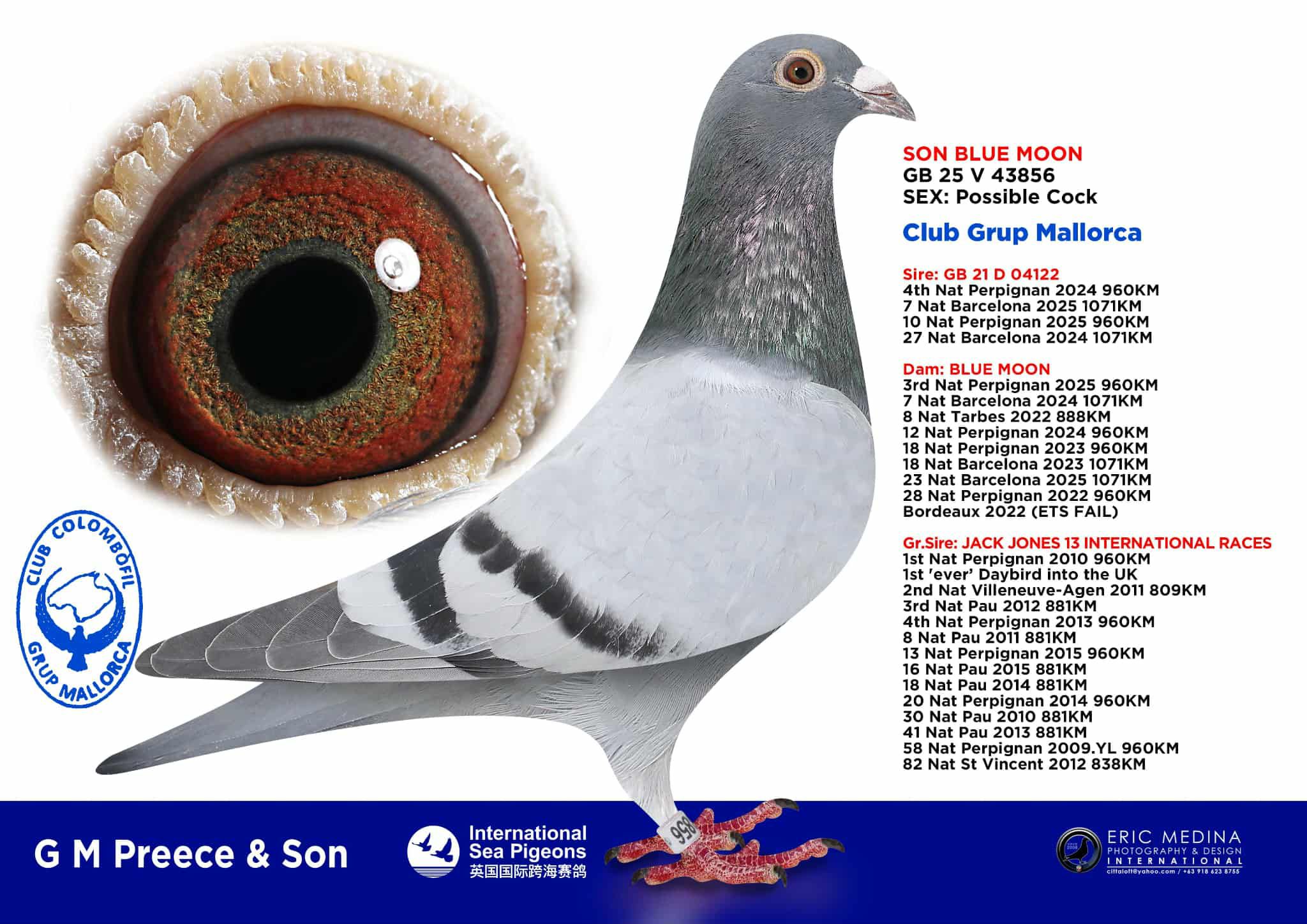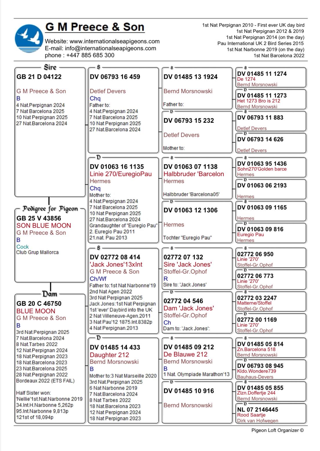 Con ambos padres en Top 10 Nacionales en Barcelona y Perpignan, este macho posee potencial excepcional como futuro reproductor para rutas de 900–1100 km.